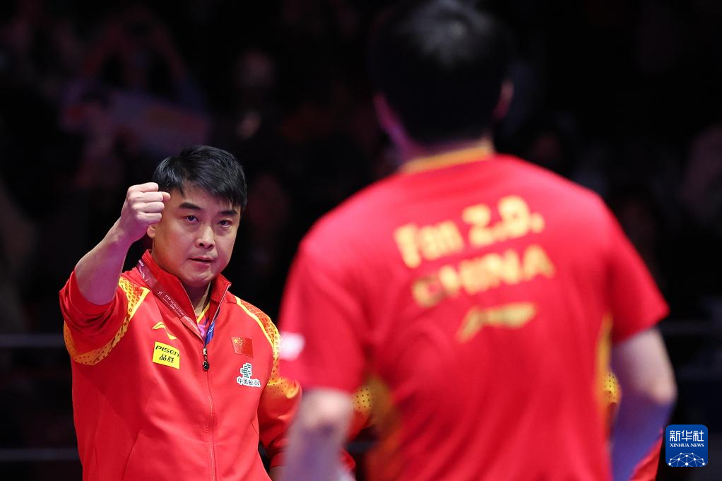 2月25日,中国队教练王皓(左)在场边为樊振东加油。樊振东3比2战胜法国队选手艾利克斯·勒布伦。