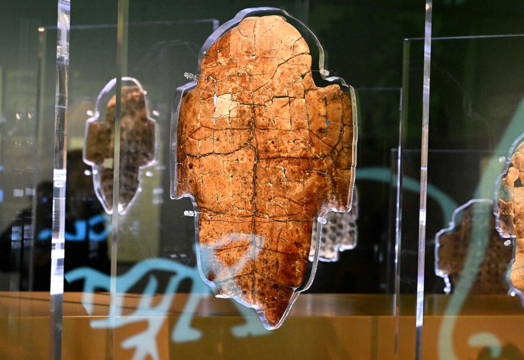 这是河南安阳殷墟博物馆新馆内展出的刻辞卜甲。新华社记者 李安 摄
