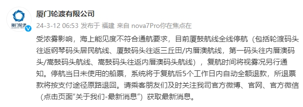 厦鼓航线全线复航