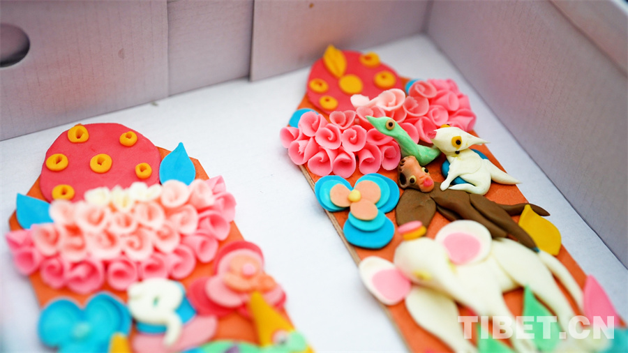 在拉萨市最大的年货市场八廓商城的东侧,售卖酥油花的摊位整齐排列。经营者大多是50岁以上的中年人,他们有丰富的手工酥油花制作经验,主要以家庭作坊的形式制作售卖,几个随手可拎起的鞋盒就是他们的“商铺”。和气四瑞、长寿六宝、吉祥八宝,经营者们用自己的巧手捏制出不同的图案,将家庭和睦、健康长寿、吉祥如意的寓意带给一户又一户人家。