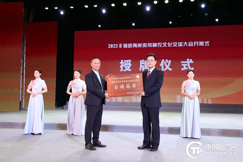 湖南省台办主任曾智夫(右)为台湾中华神农大帝协进会李火炎授予“海峡两岸炎帝神农文化交流大会台湾总召”牌匾。(中国台湾网 发)