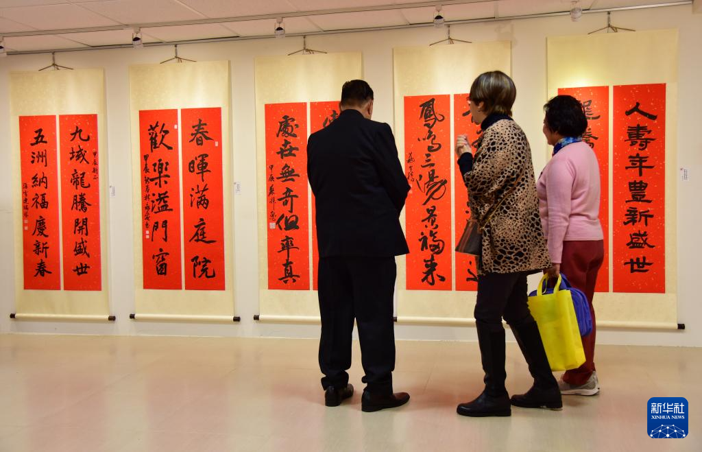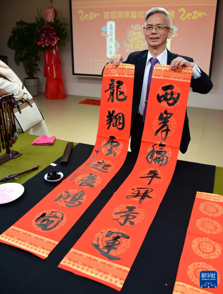 “玉兔辞旧岁,金龙贺新春”“人寿年丰新盛世,龙腾虎跃锦乾坤”“神州春暖山河秀,华夏龙腾日月新”“龙跃中华开盛世,凤翔大汉见升平”……农历甲辰龙年即将到来,两岸艺术家书写的许多春联聚焦“龙”字,开幕日前来参观的人们纷纷在作品前拍照留念,还领取了主办方准备的春联礼品,大家笑逐颜开。