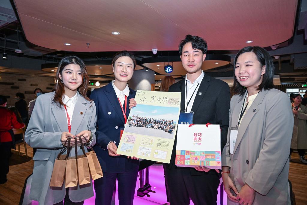 4月9日,在北京大学家园食堂,两岸师生交换礼物后合影。当日,马英九率台湾青年一行参访北京大学,与北大师生展开热烈交流。新华社记者 陈晔华 摄