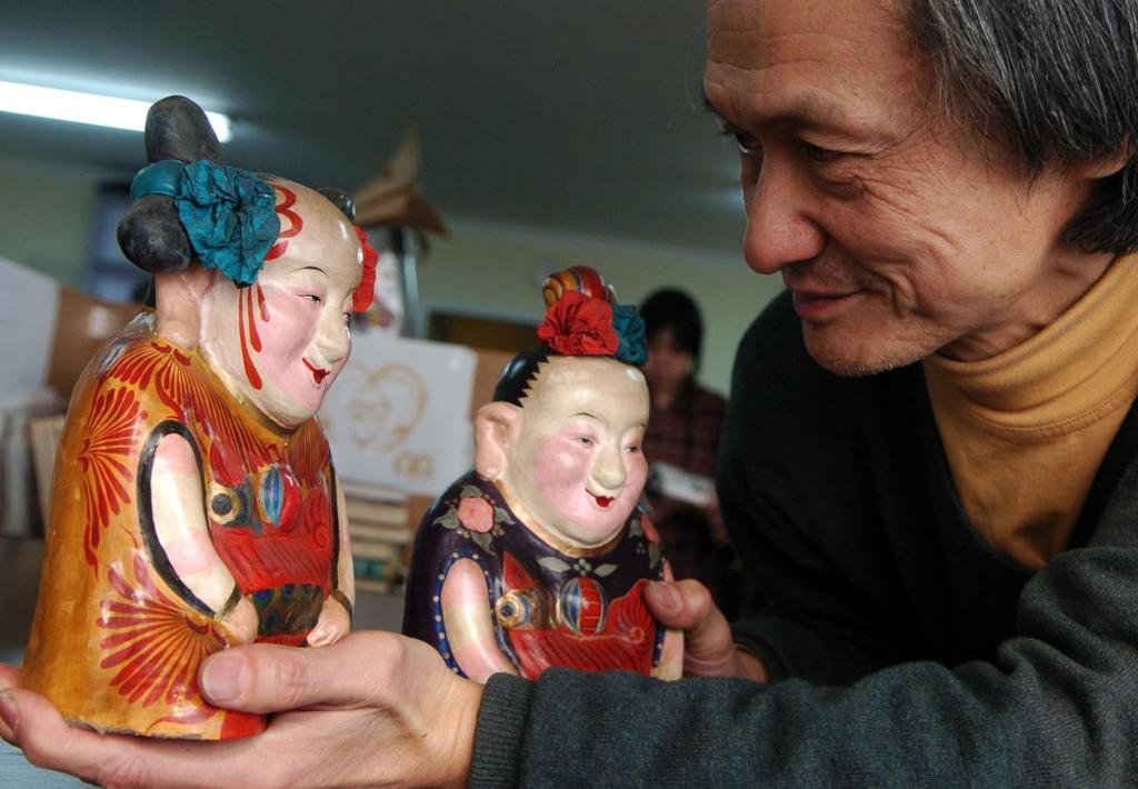2005年1月26日,黄永松在北京的工作室展示清末时期的惠山泥人珍品“大阿福”。新华社记者 李俊东 摄