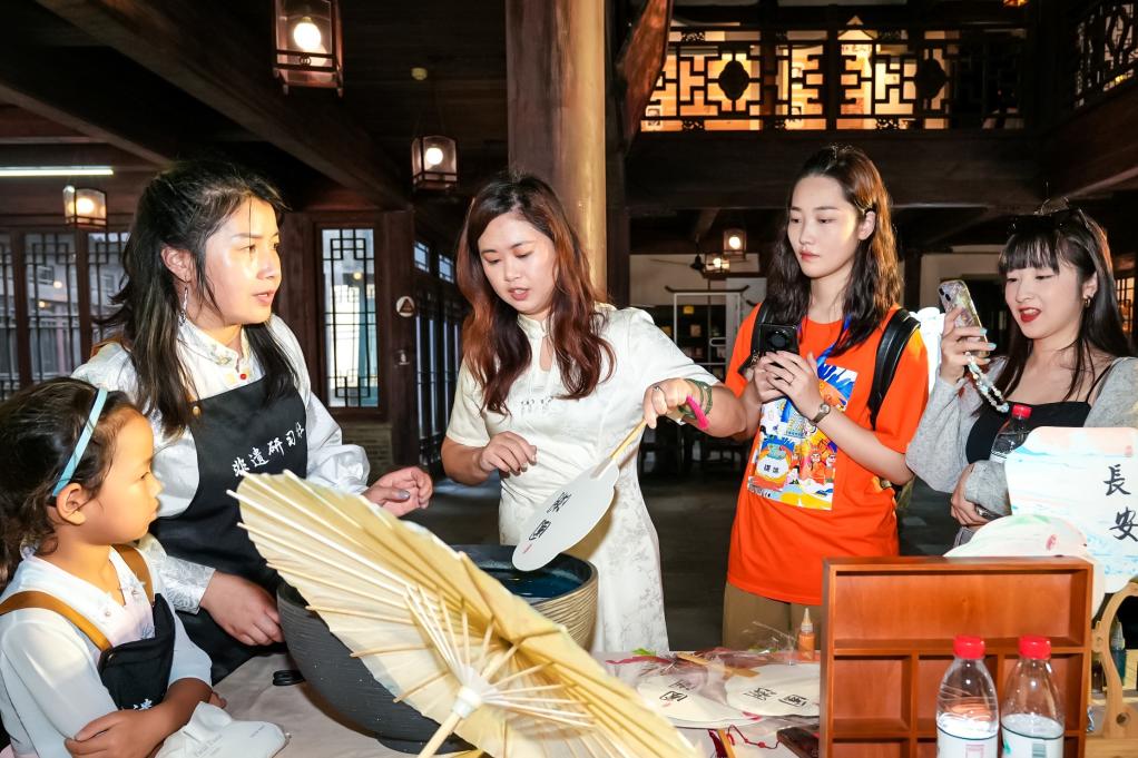8月29日,在浙江乌镇举办的“青春同行”两岸新媒体创享嘉年华上,两岸青年共同体验漆扇、制伞等非遗技艺。新华社发