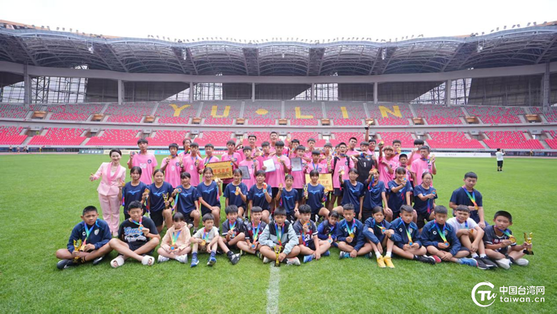 绿茵场上两岸青少年球员合影留念。(中国台湾网发)