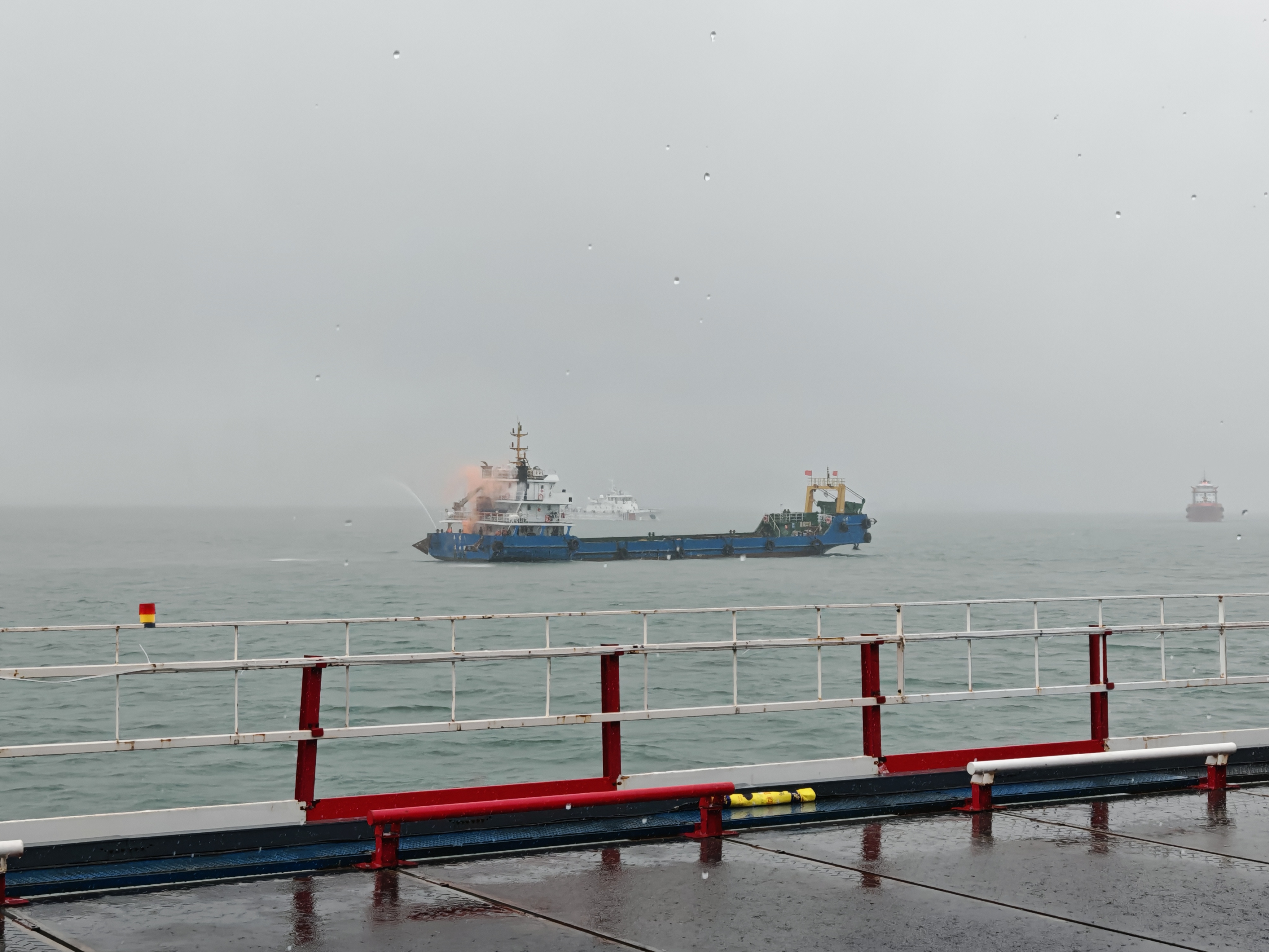 上午,嘉宾们冒着风雨来到建设中的厦金大桥(厦门段)施工平台,观摩海上搜救应急演练,通过落水人员搜救、伤员转移、船舶消防灭火、溢油围控清除等科目,沉浸式体验海上救援的迅速、精准和安全。