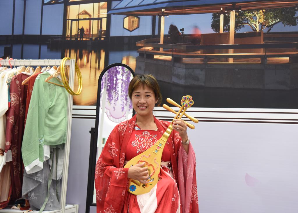 7月18日,一名观众在2025台北夏季旅展上试穿汉服并拍照留念。 新华社记者 李建华 摄