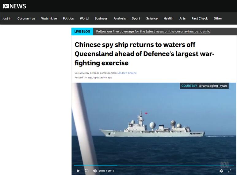 澳大利亚广播公司(ABC)7月14日报道称,在本周即将举行大规模军事演习之前,澳大利亚军方正在密切跟踪一艘向着澳大利亚昆士兰州方向航行的中国高科技侦察船。