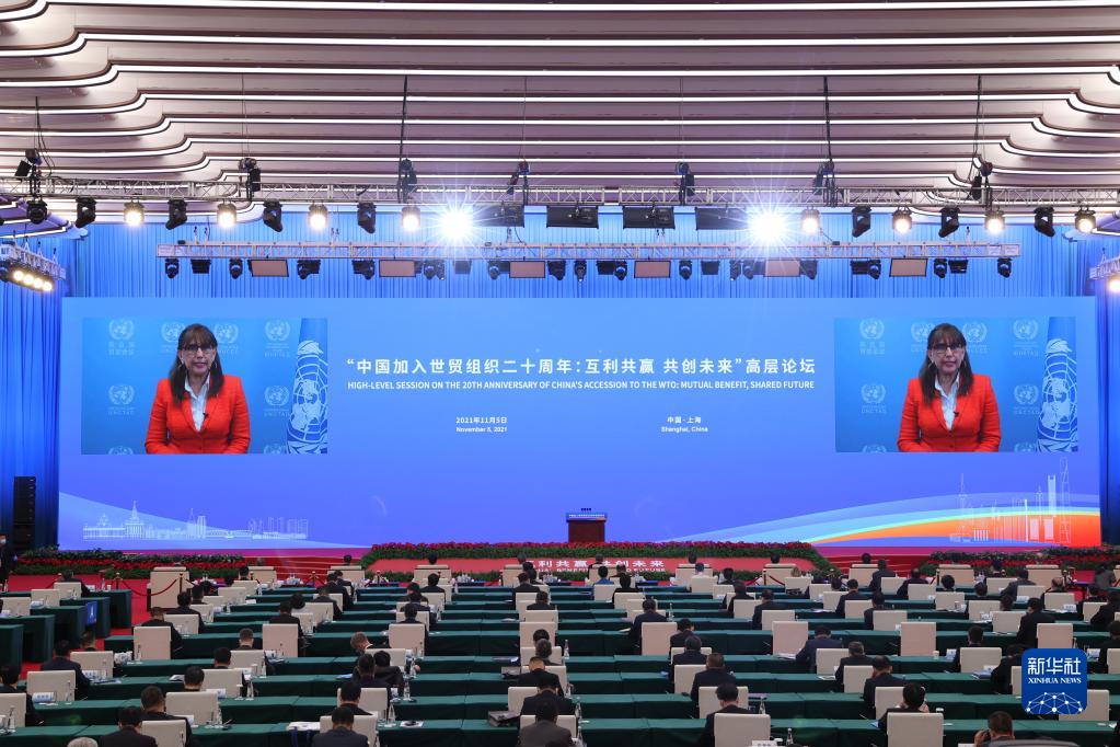 11月5日,“中国加入世贸组织二十周年:互利共赢 共创未来”高层论坛在上海举行。这是世界贸易组织总干事伊维拉在论坛上以视频方式发言。新华社记者 金立旺 摄