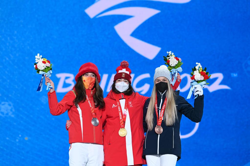 2月15日,冠军瑞士选手玛蒂尔德·格雷莫德(中)、亚军中国选手谷爱凌(左)与季军爱沙尼亚选手凯莉·西尔达鲁在奖牌颁发仪式上。新华社记者胡虎虎摄