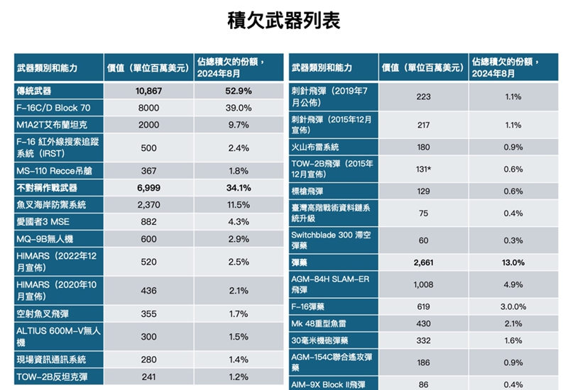 美国对台积欠武器清单。(图片来源:台湾“中时新闻网”)