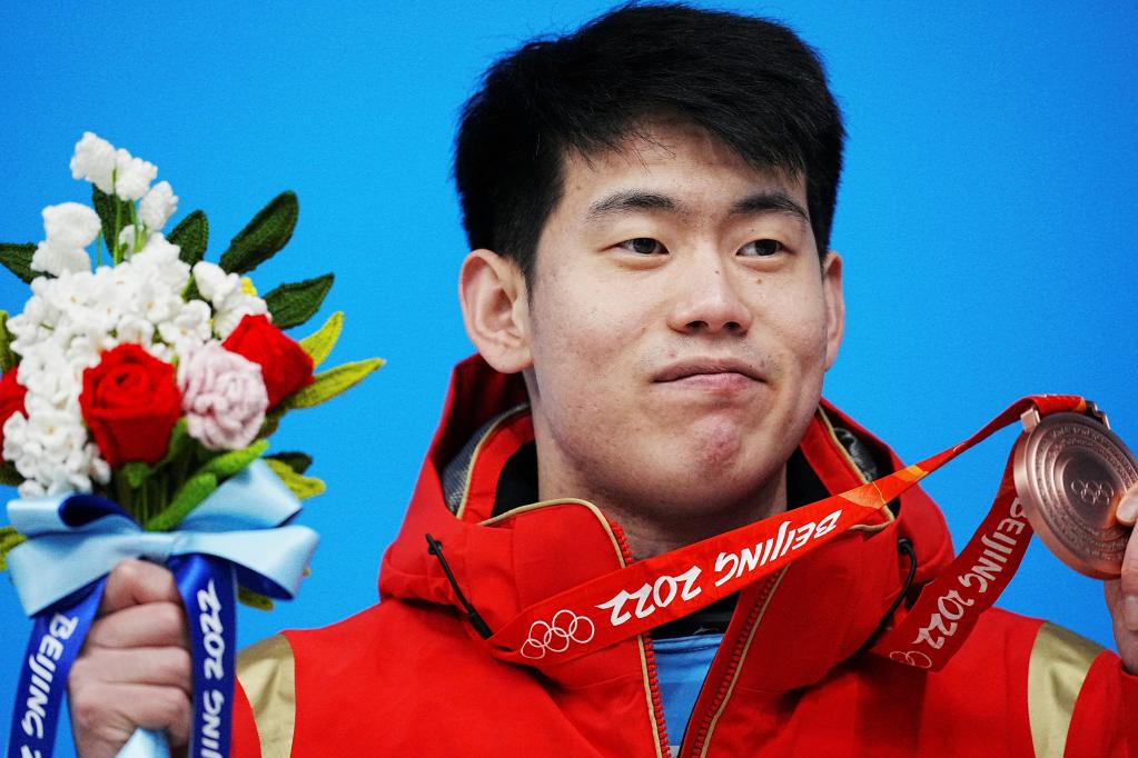 2月11日,中国选手闫文港在奖牌颁发仪式上。新华社记者贺长山摄