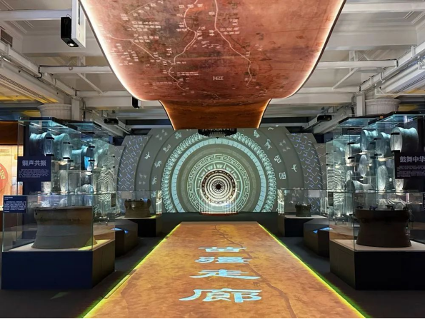 ——更沉浸。走进展厅,头顶上方是古天文图、古丝绸之路地图,脚下则是流淌着一行行经典语录的“中华文明之河”和“民族走廊”。
