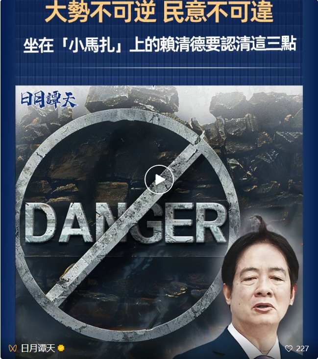 ■《日月谭天》:大势不可逆,民意不可违!坐在“小马扎”上的赖清德要认清这三点