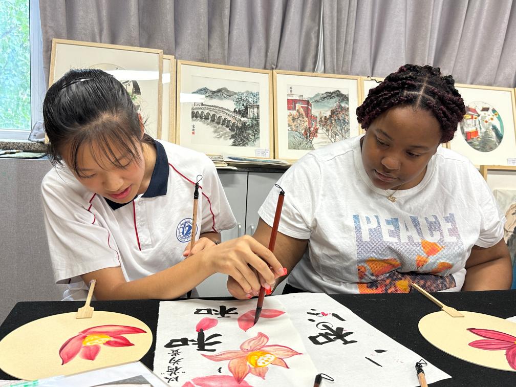 7月2日,美国青少年与北京市第十二中学学生同上国画体验课。新华社记者 袁睿 摄