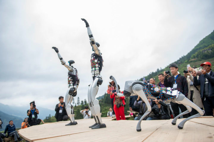 2025年4月26日,机器人在贵州省从江县加榜梯田上参加梯田走秀活动。新华社发(吴德军摄)