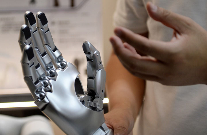 2025年3月25日,在墨现科技(东莞)有限公司,工作人员讲解机器人灵巧手上的电子皮肤。新华社记者刘勇贞摄