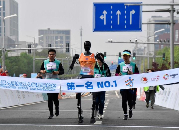 2025年4月19日,在北京亦庄举行的2025北京亦庄半程马拉松暨人形机器人半程马拉松比赛上,天工队选手天工Ultra(左二)冲向终点。新华社记者李欣摄