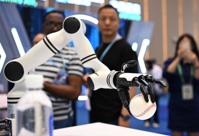 2025年4月15日,在第137届广交会服务机器人专区,机械臂展示灵巧手功能。新华社记者邓华摄