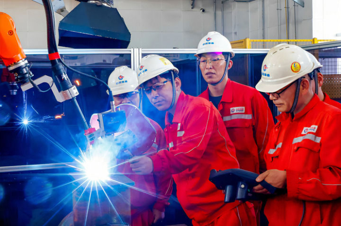 2025年4月29日,在海油工程天津智能化制造基地,刘海林(左二)和同事调试一台焊接机器人。新华社发(杜鹏辉摄)
