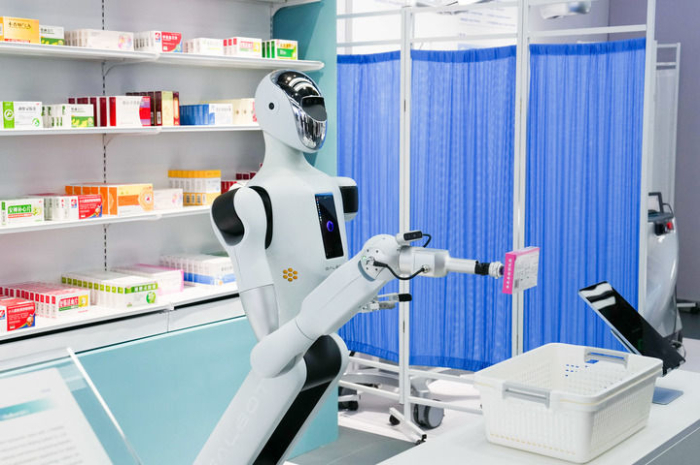 2025年2月24日,在北京“机器人大世界”的应用场景示范区,银河通用机器人进行药店无人值守场景演示。新华社记者鞠焕宗摄