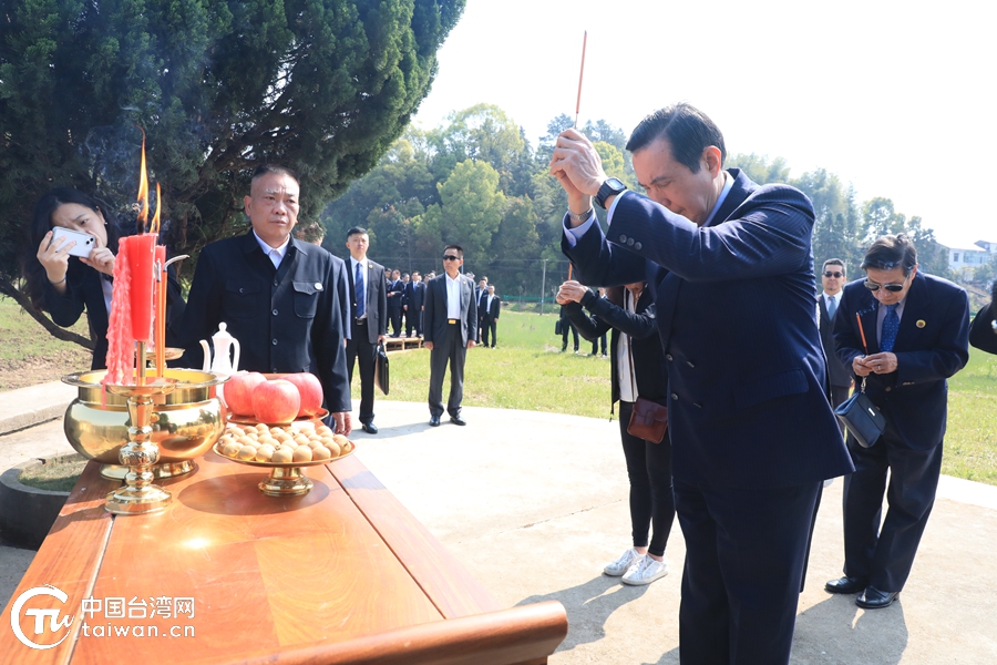 马英九与家人沿田间小道前往祖墓。马英九走到墓前,手抚墓围,深情凝视墓碑。祭祖仪式开始,马英九与家人在墓前肃立。仪式遵循当地世代承袭的习俗,鸣炮之后,马英九和家人行三上香礼。马英九敬献鲜花、果品后,全程用湖南方言宣读祭祖文。他说,“亲爱的公公(指马英九祖父),这是我一生第一次来大陆祭祖与探亲,内心非常感动,您的遗训,使我们子女都懂得自爱自强,为善助人,尽忠职守。这是我们人生最宝贵的资产,取之不尽,用之不竭。”