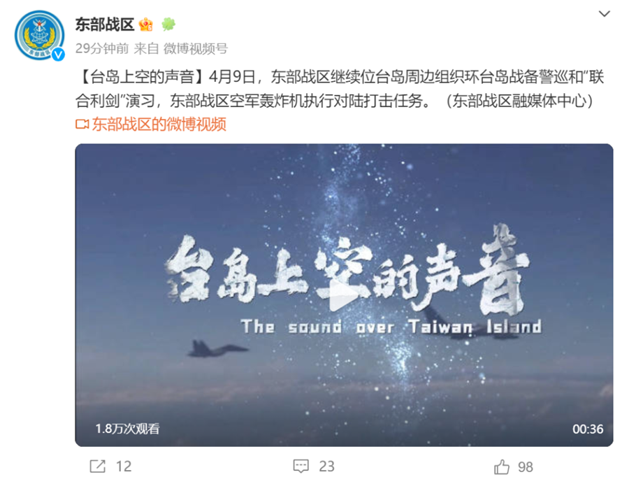 4月9日,东部战区继续位台岛周边组织环台岛战备警巡和“联合利剑”演习,东部战区空军轰炸机执行对陆打击任务。(东部战区融媒体中心)