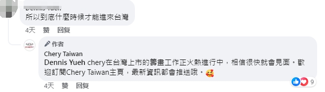 早前,奇瑞官方在脸书创立“Chery Taiwan”,并从去年开始更新专业内容,针对一款中型运动型多用途汽车已多次发布宣传影片。有不少台湾网友在该账号咨询该款汽车何时会在台湾上市,该账号回复,目前在台湾上市的筹划工作正火热进行中,相信很快就会见面。