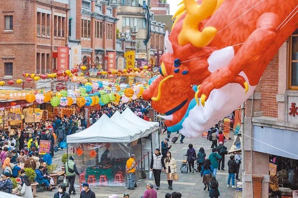 在老牌迪化街商圈,街区挂上了各式龙形充气装置和色彩艳丽的布条、灯笼,糖果点心、烘烤肉干、花生瓜子等各种年货琳琅满目,现场还举办抓红包、写春联等活动。不想体验人挤人?还可以通过线上专区来采购。