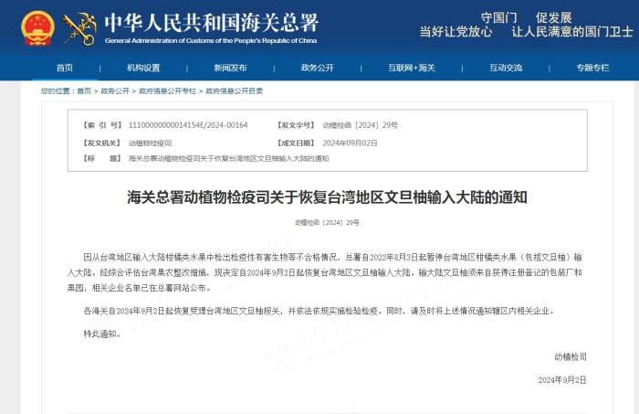 各海关自2024年9月2日起恢复受理台湾地区文旦柚报关,并依法依规实施检验检疫。同时,请及时将上述情况通知辖区内相关企业。