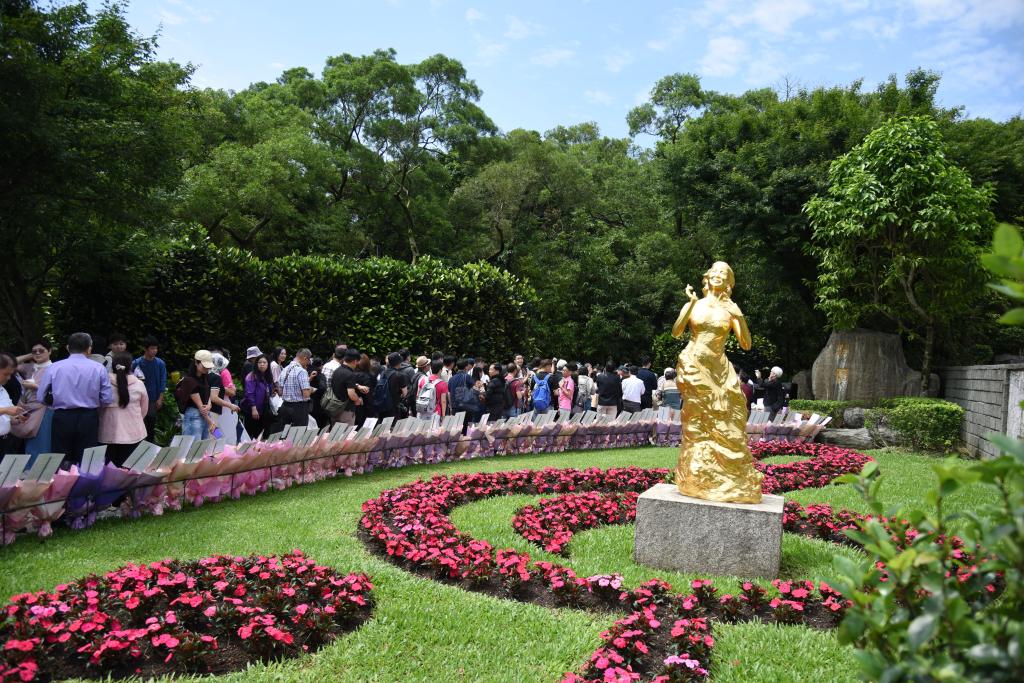 “君声丽影,岁岁年年”“时光匆匆30载,我只在乎你”……在花圃拼成的音符中央,邓丽君的金色雕像亭亭玉立,被歌迷们送来的鲜花簇拥。