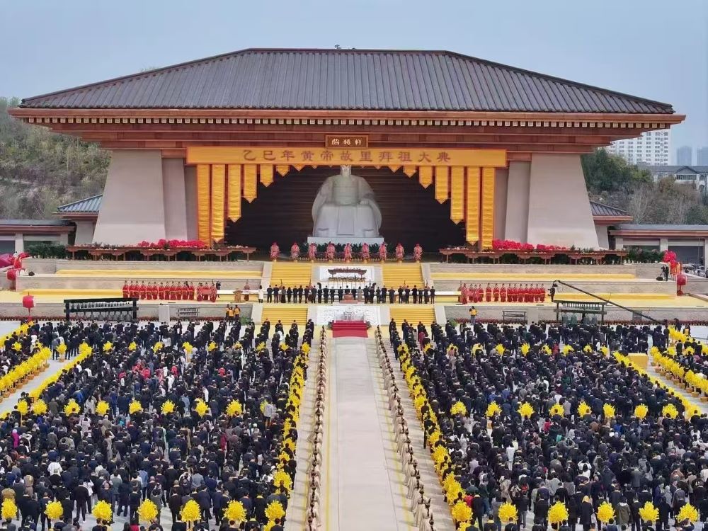 黄帝故里景区庄严肃穆,众多来自海内外的华夏儿女汇聚在这里,共拜轩辕黄帝,祈福祖国繁荣昌盛,祝愿世界和平和睦。在黄帝故里广场,悠远宏阔的《黄帝颂》乐曲响彻,上海台联访问团成员怀着崇敬的心情,与在场的五千余名海内外同胞代表整装肃立,共同向中华民族的人文始祖轩辕黄帝致以最崇高的敬意。