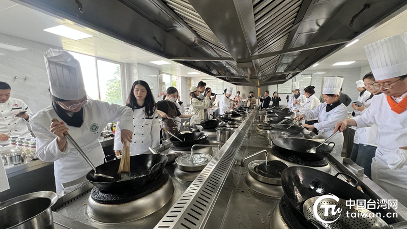 两岸媒体参访团与四川旅游学院的同学们同做经典川菜——辣子鸡丁,川菜实验室中烟火气十足,现场一片火热。(中国台湾网记者 孙路路 摄)